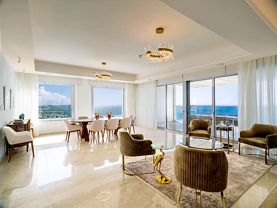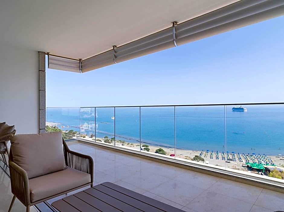 These modern and spacious suites provide every modern comfort and luxury. A large double bed looks over the side glorious views of the hotel which incorporates the mountainous backdrop against Limassol's beautiful bay. A luxurious free standing signature bathtub is incorporated into the room along with a large rain shower cubicle, separate WC, two washbasins and contemporary lighting features. The lounge has its own WC and a second TV which can be viewed from either the dining area or the comfortable designer sofa, while overlooking the blue azure of the Mediterranean.